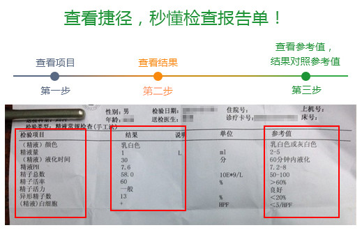 看点一,精液报告: 侧重于看精液量,精液颜色,液化时间,酸碱度(PH),精子 存活率,精子活力,异性精子数,白细胞等。特别提醒:不同医院精液检查报告单显示 项目指标不一,看主要项目。