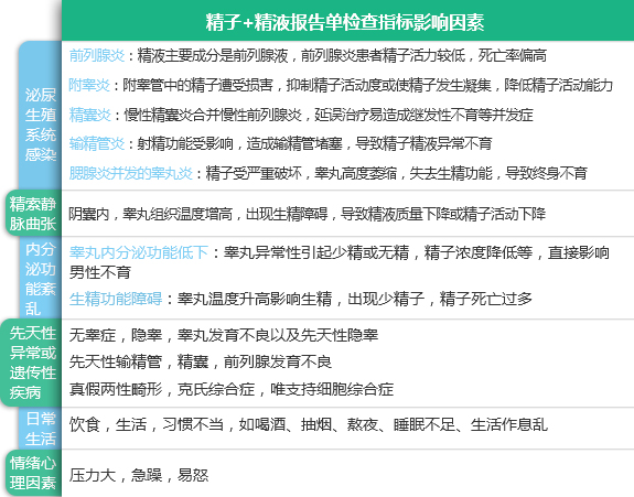 如果男性自身内分泌功能紊乱,受泌尿生殖系统感染等情况影响 ,精液质量受影响,精子无法存活或受阻,直接导致检查报告单结果 不在参考值范围。上海九龙男子医院郑行超主任指出:报告单显示精 子精液结果异常影响因素较多,治疗前需明确具体病因,以防盲目。