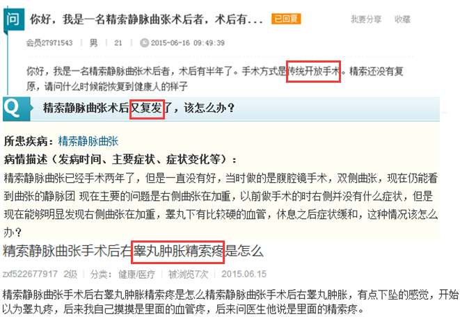 网友咨询:精索静脉曲张术后又有了?手术半年后还没有恢复,多久恢复?术后两年了还没有怀孕?术后阴囊肿胀引起后遗症……