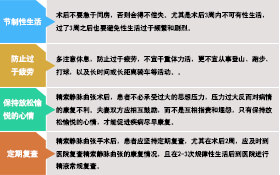陈希求医师说:精索曲张术后康复率跟患者术后的护理是十分重要的。精索静脉曲张患者在术后要保持心情放松舒畅,注意饮食调整,不要吃辛辣刺激性食物,戒烟戒酒,不要长时间站立和坐立,注意劳逸结合。在术后一段时间内较好不要有过度频繁的房事,也不要经常手淫,保持阴囊和睾丸的清洁。随时注意自己的病情,咨询医生及时进行病情沟通,一旦出现的病症一定要及时到医院进行复诊。医生精索曲张后多久能过性生活?一周就过了性生活有影响吗?