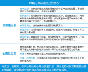上海九龙男子医院 电话咨询上海九龙男子医院泌尿外科医师韩用涛主任指出:射精无力也可称部分射精不全,它的特征是泄精正常而射精阶段异常,属于射精障碍。表现为男子在行房中情欲达到高峰而射精时却没有足够的力量将精液射入女性的阴道内的现象,常伴随这些症状:遗精、射精疼、 精液少、 器质性早泄、 精液稀等,主要由于生理性因素和心理性因素引起。射精无力可能会继发性欲减退、导致性冷淡甚至阳痿,影响夫妻感情,严重的由于射精无力导致精子精液无法正常运动从而影响生育等,患者需重视。我要直接和主任对话,点击进入医师免费咨询专区