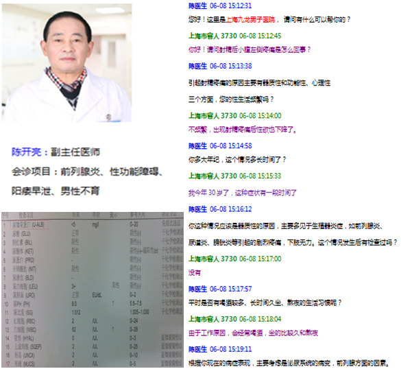【及时就诊,及时治疗】6月8日,张先生通过上海九龙男子医院网络在线医师陈开亮主任的初步诊断病症是由泌尿系统感染引起的炎症,具体诊断需来院面诊。三天之后,张先生来院检查治疗,陈主任负责就诊,建议做尿常规检查进一步诊断,结果显示:尿白细胞增多,显示为阳性,尿PH值超大于7.5,超出正常范围。终诊断为尿道炎。
