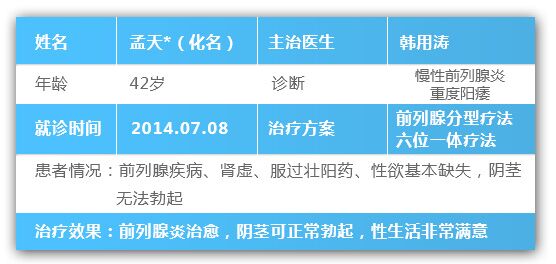 【主任亲诊,重塑“硬汉”】主任针对此情况,采用前列腺分型疗法进行治疗,继而采用六位一体疗法心理以及物理仪器,中西综合调理治疗。14年7月20日次复查中前列腺液白细胞为8,前列腺炎已完全控制,14年8月3日回访性欲回升,阴茎硬度以及勃起正常。今年5月和前妻复婚。想请主任也帮我检查看看我的情况,抢先预约他的诊号