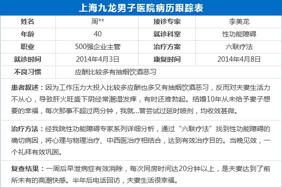 陈小姐:近期和老公夫妻生活不是很和谐,关键时刻老公掉链子,因为是公司老板,所以很注重面子和尊严。在网上与九龙医师咨询了相关症状,诊断是早泄惹的祸。在医师的建议下,3月6日带老公来到九龙男子医院接受“六联疗法”治疗。3个月后电话回访,夫妻生活很和谐无任何异常现象。