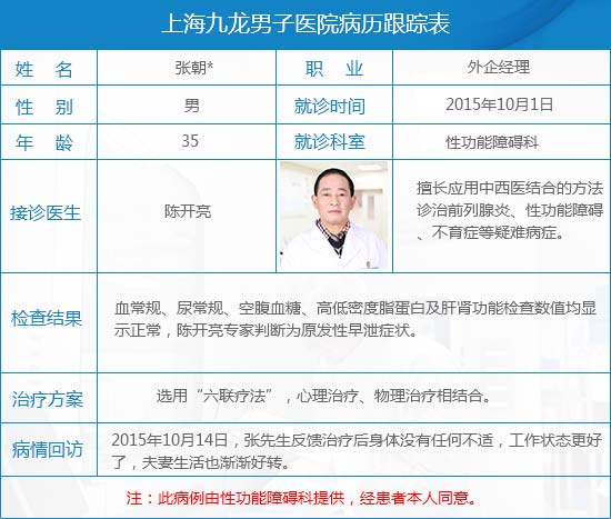 张先生,35岁,外企经理,工作压力巨大。由于张先生有早泄症状,在夫妻性生活方面,往往力不从心。张先生在妻子劝说下接受中医长达3个月的药食同补治疗,除了每天需要服用中医开的药,还要餐餐食用大蚯蚓、牡蛎、猪腰、麻雀肉、青虾此类食物,张先生身心俱疲,对性生活越来越冷淡。2015年10月1日,张先生在同事介绍下来我院就诊。陈开亮医师了解到,张先生由于工作繁忙,常外出应酬,久坐娱乐,过度疲劳导致的早泄。外加,没有及时选择正确方式治疗,情绪紧张、心理崩溃导致早泄症状加剧。