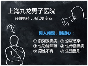上海九龙男子医院是一所集预防保健,医疗,康复服务为一体的现代化综合男性专科医院。医院以"专病专治"为特色,全心致力男性六大男科疾病的研究与临床诊治,秉承“弘扬医德、尊重科学、诚信求精、毕生奉献”的办院宗旨一直服务于全国男性朋友健康的一线,为每一位到院的患者提供有效的诊疗方案,达到治好疾病的目的。立即预约治疗,点击预约